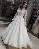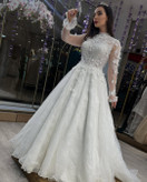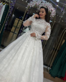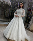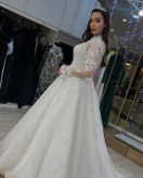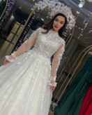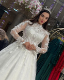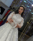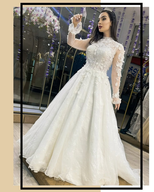 این لباس عروس زیبا با طراحی بینظیر، جلوهای از ترکیب اصالت و مدرنیته است: پارچهای از تورهای ظریف و لوکس که با نقشهای گلدار طراحی شده، حسی از لطافت و زنانگی را به ارمغان میآورد. دامن لباس هماهنگ با بالاتنه، بسیار شیک تزئین شده که ظرافت خاصی به لباس میبخشد. طراحی آستینهای بلند و نیمه شفاف، همراه با یقهای بسته و دنبالهای مجلل، جلوهای شاهانه ایجاد کرده است. انعطافپذیری مدل با قابلیت تغییر به حالت بدون آستین، این لباس را برای سلیقههای متفاوت منحصربهفرد میکند. وقتی زیبایی کلاسیک با مد روز همسو میشود، نتیجهاش چنین شاهکاری است.