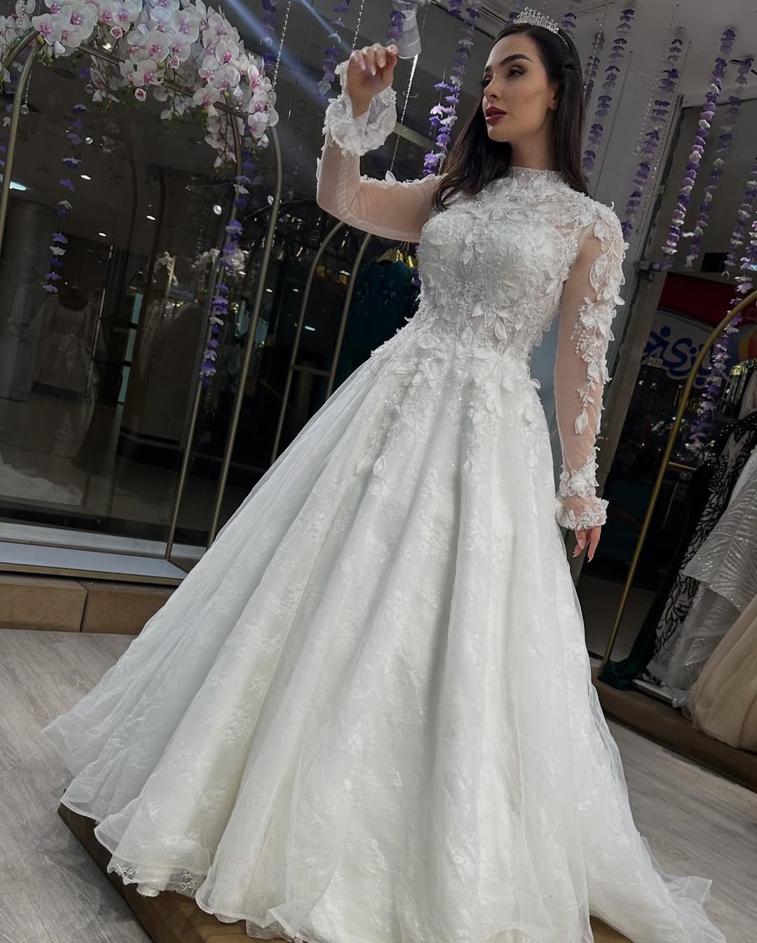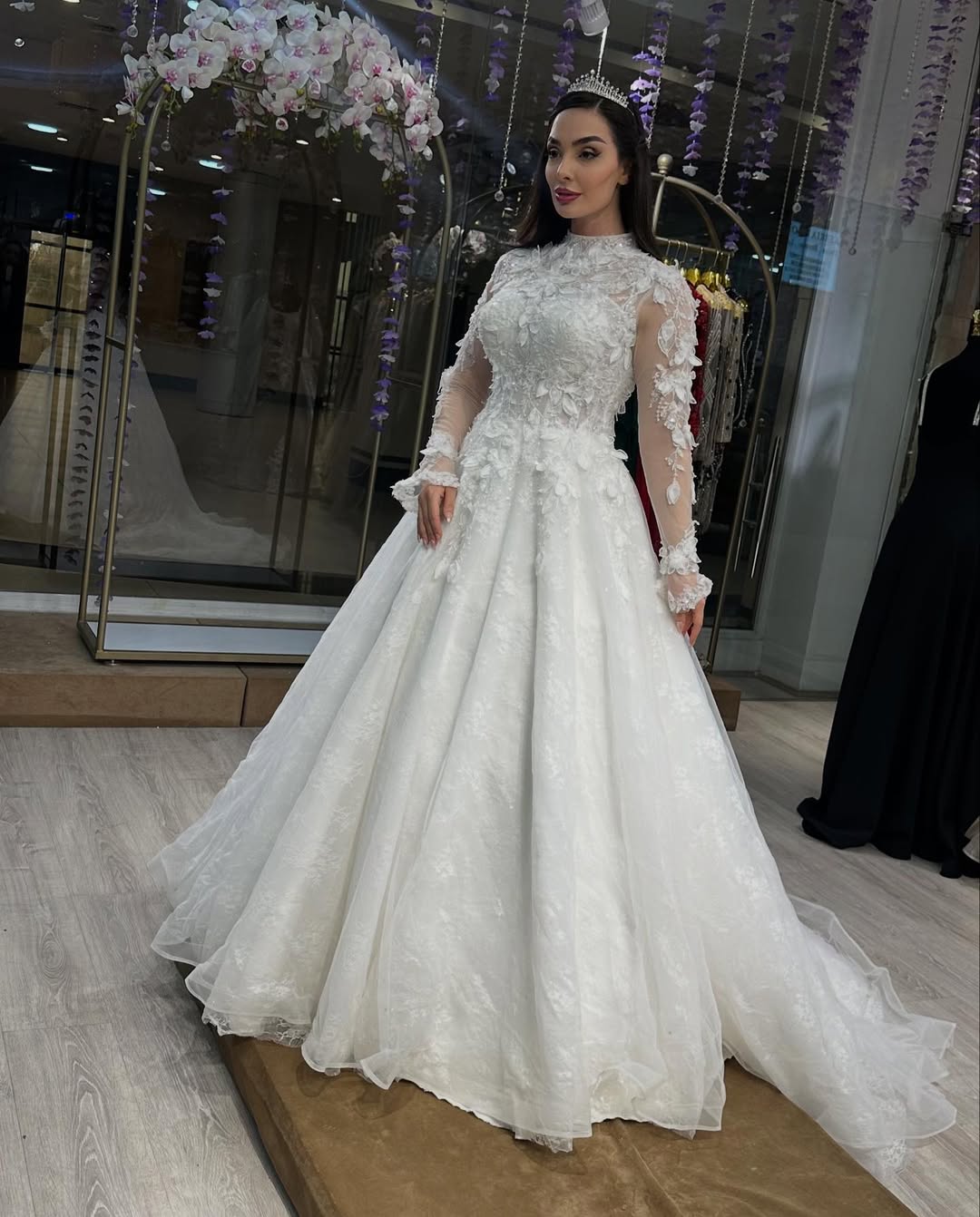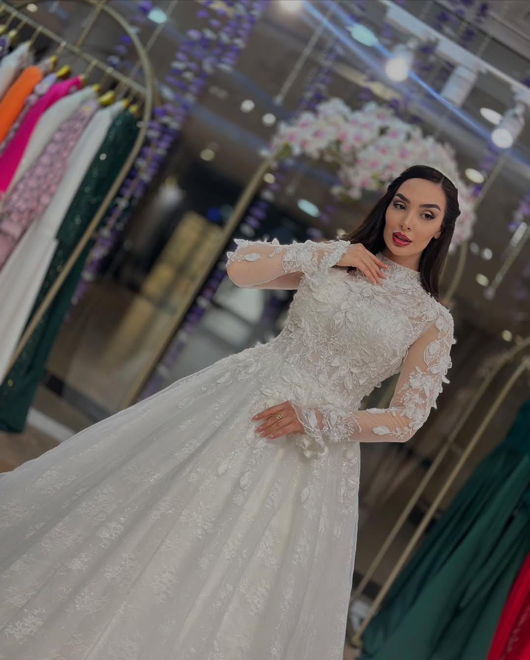 این لباس عروس زیبا با طراحی بینظیر، جلوهای از ترکیب اصالت و مدرنیته است: پارچهای از تورهای ظریف و لوکس که با نقشهای گلدار طراحی شده، حسی از لطافت و زنانگی را به ارمغان میآورد. دامن لباس هماهنگ با بالاتنه، بسیار شیک تزئین شده که ظرافت خاصی به لباس میبخشد. طراحی آستینهای بلند و نیمه شفاف، همراه با یقهای بسته و دنبالهای مجلل، جلوهای شاهانه ایجاد کرده است. انعطافپذیری مدل با قابلیت تغییر به حالت بدون آستین، این لباس را برای سلیقههای متفاوت منحصربهفرد میکند. وقتی زیبایی کلاسیک با مد روز همسو میشود، نتیجهاش چنین شاهکاری است.