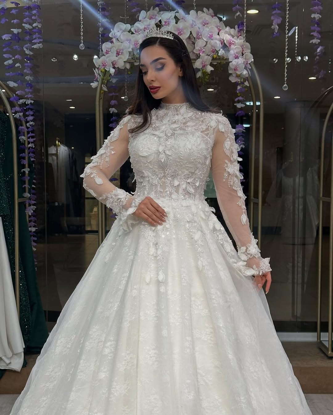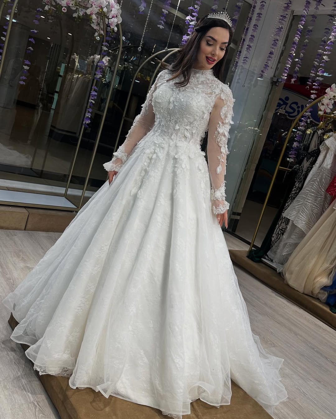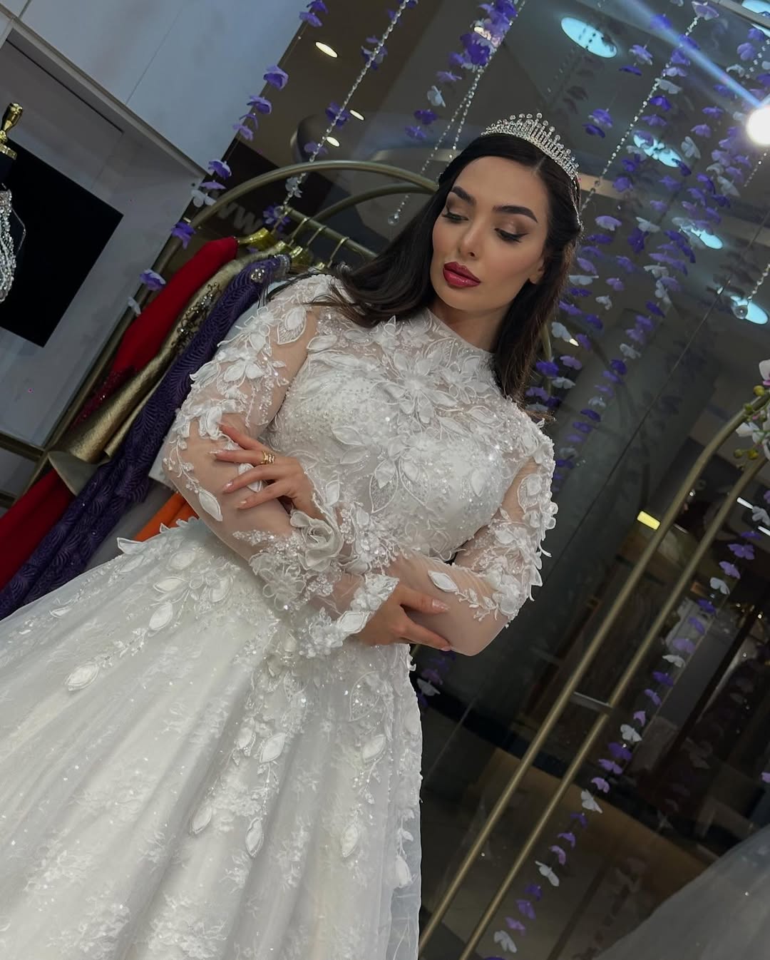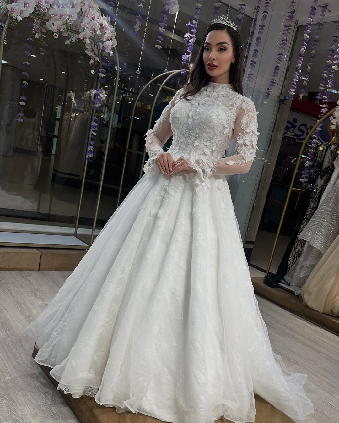 این لباس عروس زیبا با طراحی بینظیر، جلوهای از ترکیب اصالت و مدرنیته است: پارچهای از تورهای ظریف و لوکس که با نقشهای گلدار طراحی شده، حسی از لطافت و زنانگی را به ارمغان میآورد. دامن لباس هماهنگ با بالاتنه، بسیار شیک تزئین شده که ظرافت خاصی به لباس میبخشد. طراحی آستینهای بلند و نیمه شفاف، همراه با یقهای بسته و دنبالهای مجلل، جلوهای شاهانه ایجاد کرده است. انعطافپذیری مدل با قابلیت تغییر به حالت بدون آستین، این لباس را برای سلیقههای متفاوت منحصربهفرد میکند. وقتی زیبایی کلاسیک با مد روز همسو میشود، نتیجهاش چنین شاهکاری است.
