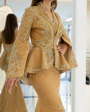 اگه دنبال یه کت دامن لاکچری و خاص میگردی که همه رو میخکوب کنه، این مدل رو از دست نده ترکیب فوقالعادهی برش ماهی با آستینهای شنلی، یه جذابیت اشرافی بهت میده کار دستِ ظریف با مروارید و سنگهای طلایی باعث میشه مثل الماس بدرخشی دامن فونشده با طراحی عمودی قدتو بلندتر و کشیدهتر نشون میده بالاتنهی پپلوم کمرتو باریکتر و خوشفرمتر نشون میده این لباس مخصوص کسیه که میخواد خاص، جسور و متفاوت باشه میخوای بدرخشی؟ همین الان بده و سفارشتو ثبت کن