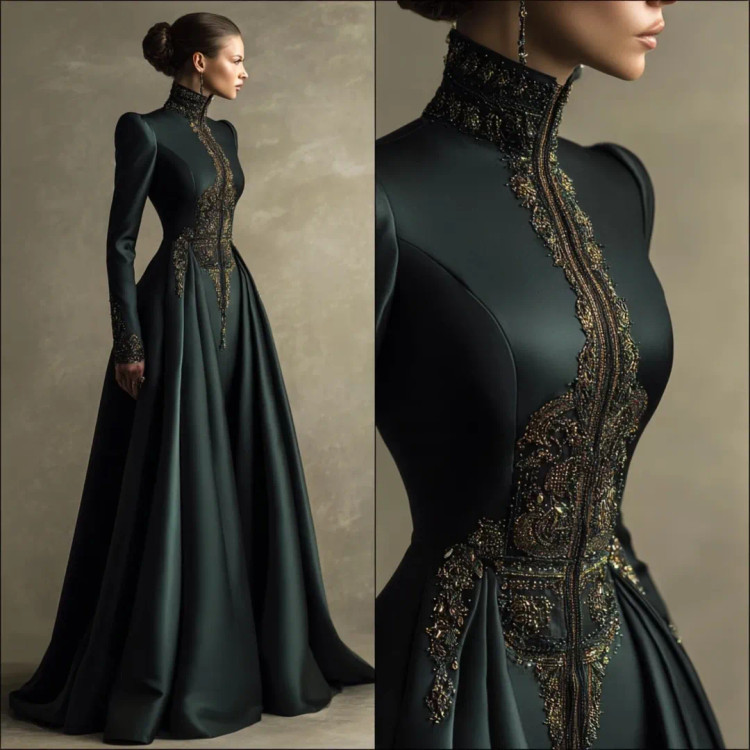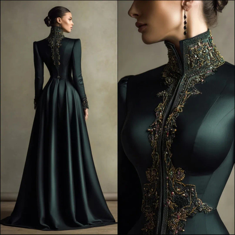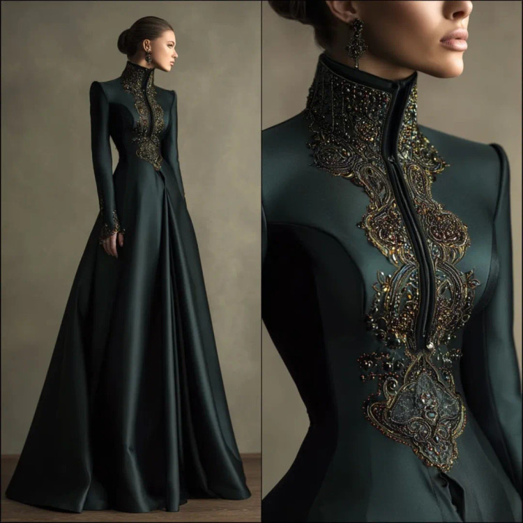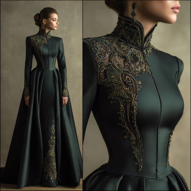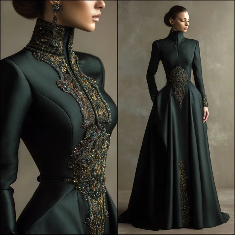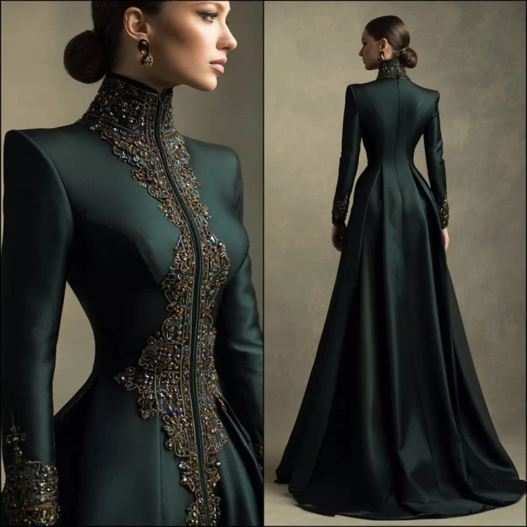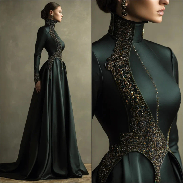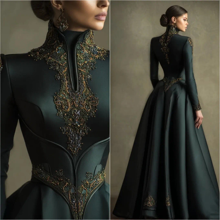 شکوه سلطنتی در قالب یک لباس وقتی هنر دوخت و جواهرکاری دستساز در کنار ساتن براق سبز تیره و مشکی قرار میگیرند، نتیجه چیزی جز یک شاهکار نیست. یقه ایستادهی پوشیده با سنگدوزیهای درشت طلایی–برنزی، طرح مرکزی چشمگیر بر روی دامن A‑line، و آستینهای تمامقدی.