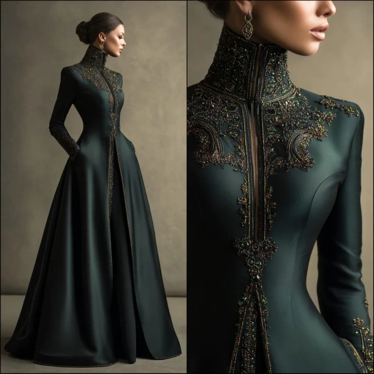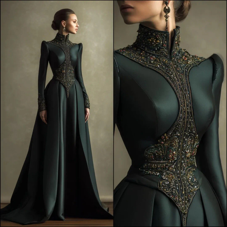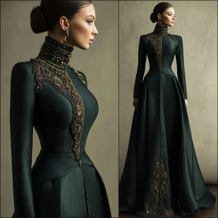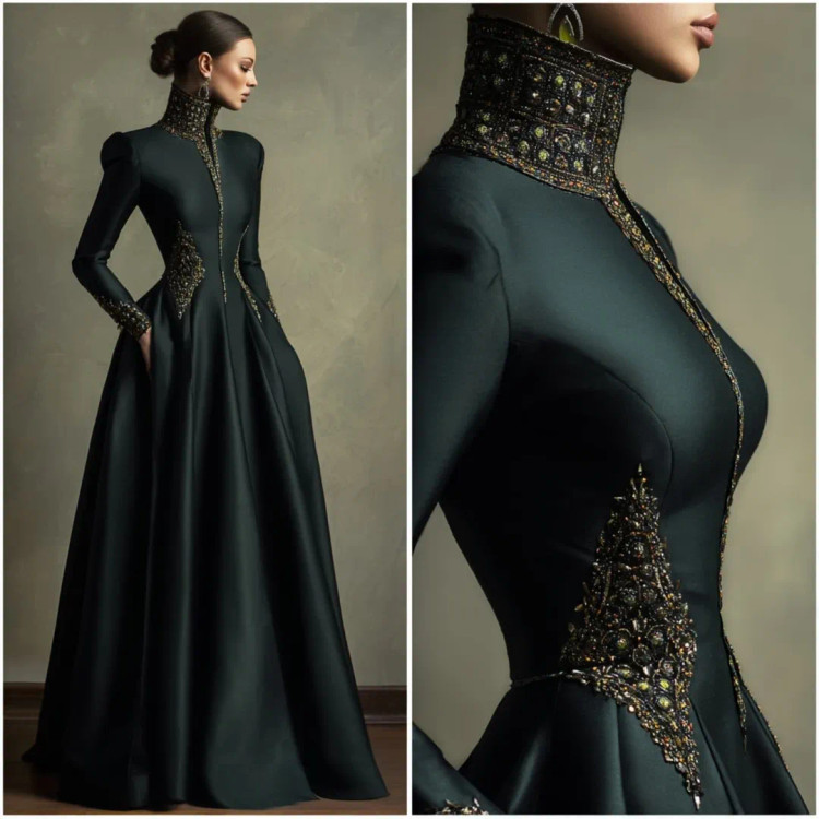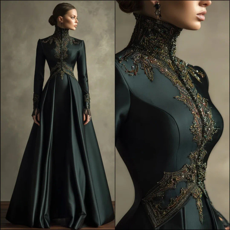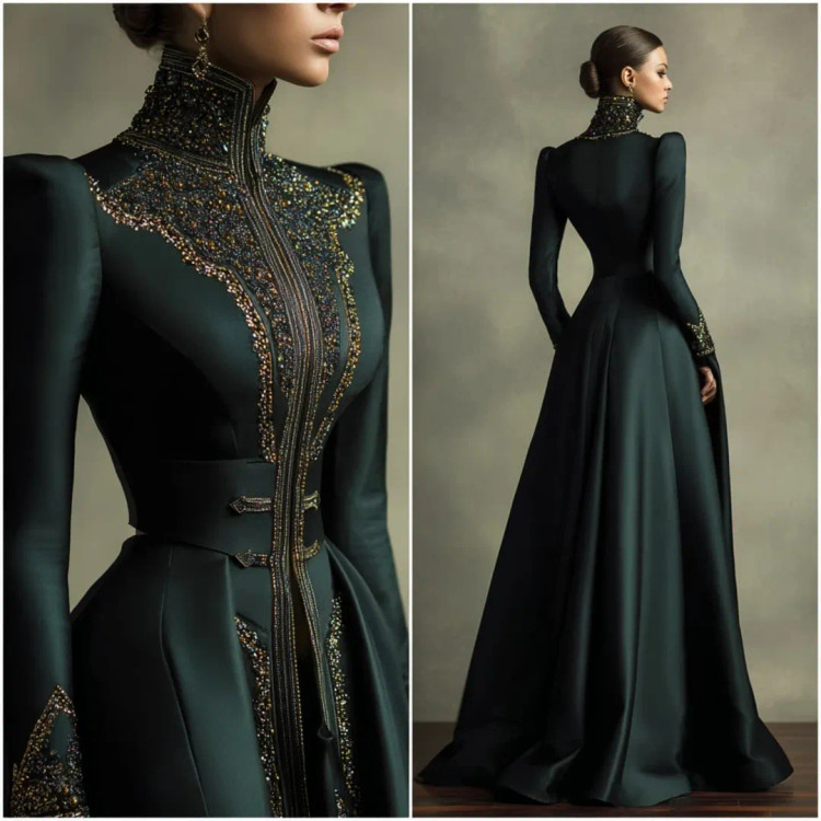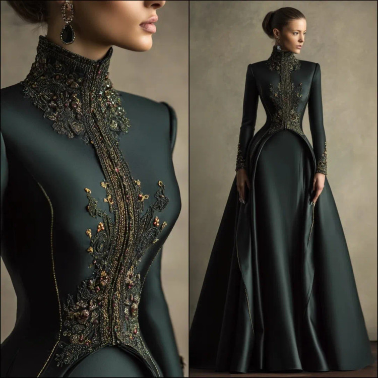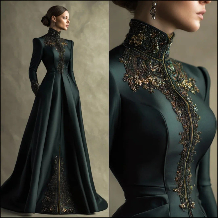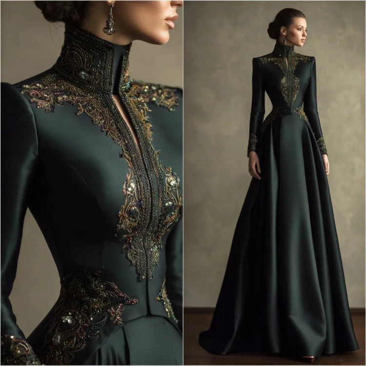 شکوه سلطنتی در قالب یک لباس وقتی هنر دوخت و جواهرکاری دستساز در کنار ساتن براق سبز تیره و مشکی قرار میگیرند، نتیجه چیزی جز یک شاهکار نیست. یقه ایستادهی پوشیده با سنگدوزیهای درشت طلایی–برنزی، طرح مرکزی چشمگیر بر روی دامن A‑line، و آستینهای تمامقدی.