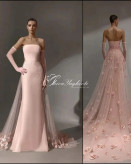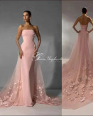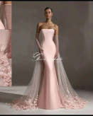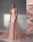 این طراحی ظریف، ترکیبی از سادگی و ظرافت: پارچه ساتن صورتی ملایم با تنپوش فیت و خط دوخت تمیز، آستینهای توری مرواریددار که درخششی لطیف ایجاد میکنند و دنباله بلند با گلآرایی پایانی که هر قدم را خاص میکند.
