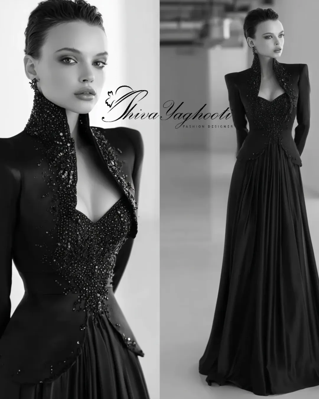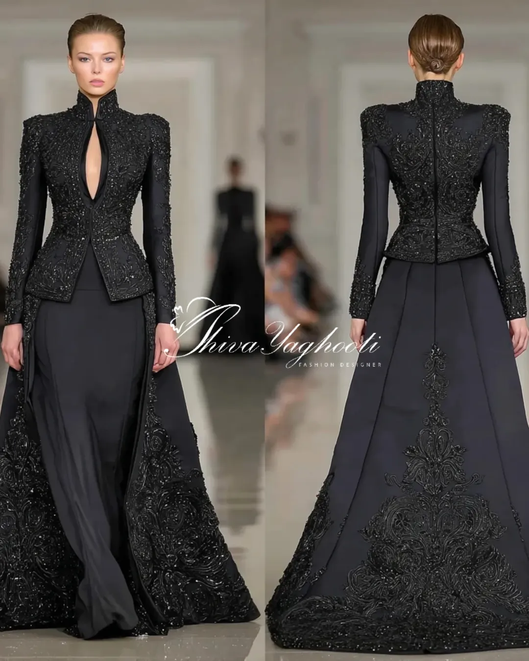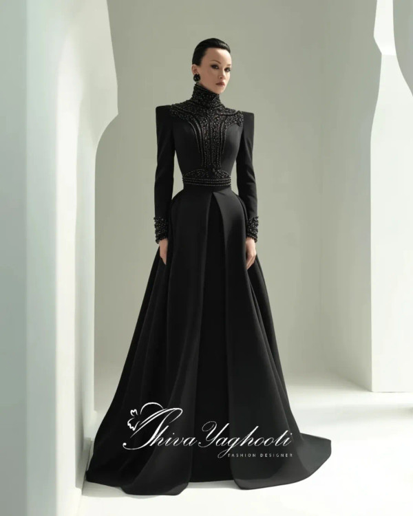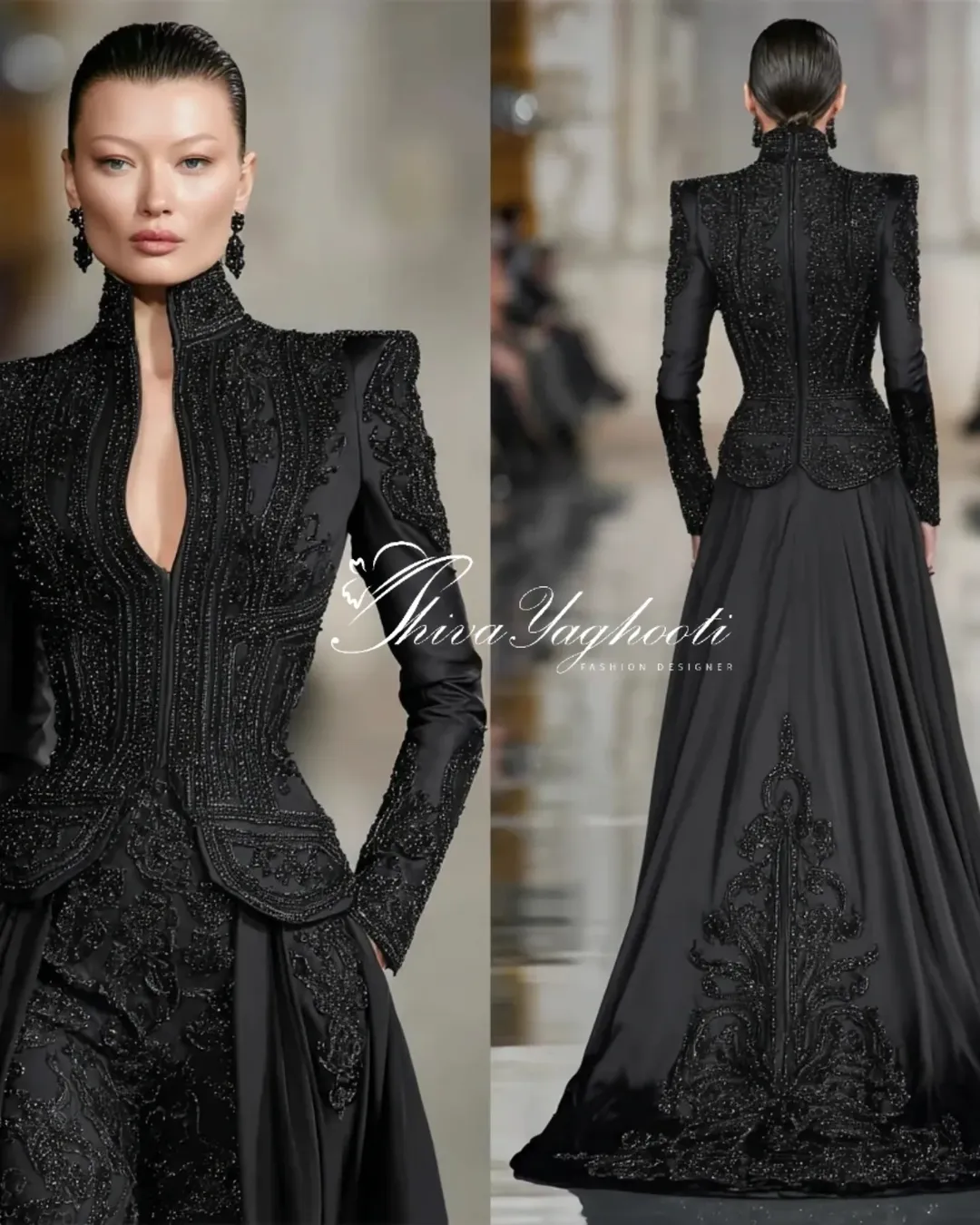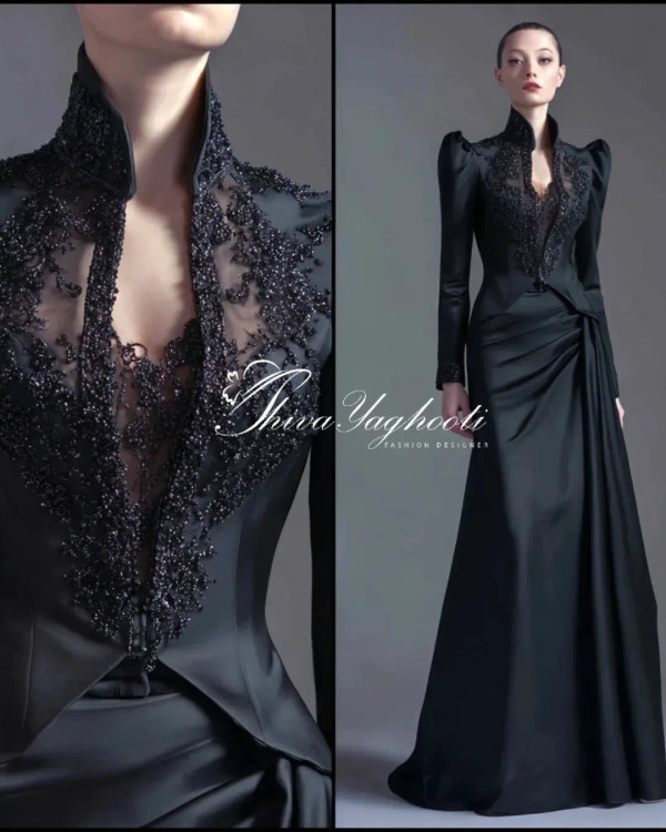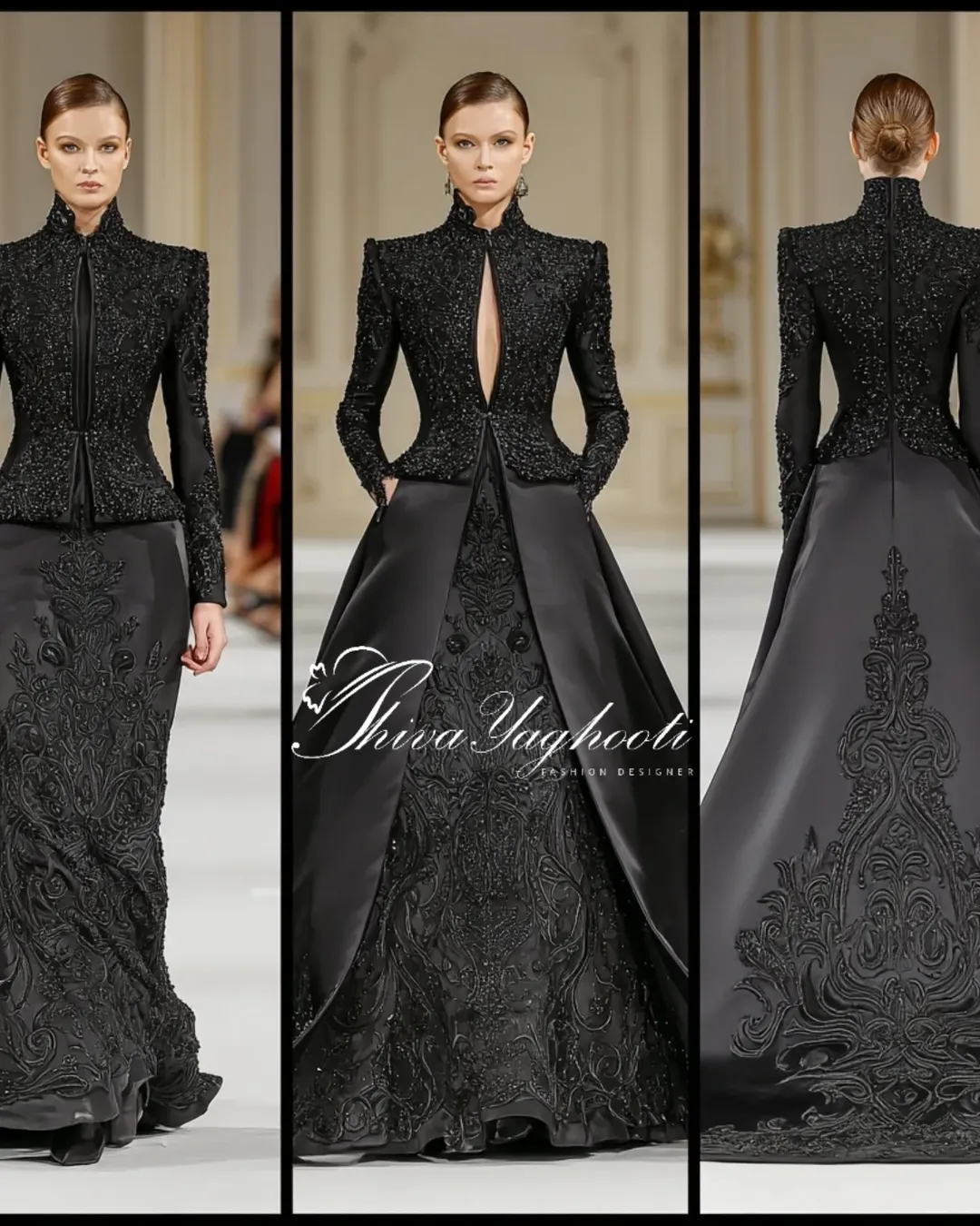 شکوه تاریکی با امضای فاخر این مجموعهی خاص از مزون شیوا یاقوتی، ترکیبی از برشهای سلطنتی، یقههای ایستاده و دامنهای حجیم ساتن است که با سنگدوزیهای ظریف و هنر گلدوزی دستساز تزئین شدهاند. مناسب برای مراسم های مختلط، عقد، عروسی، و رویدادهای لاکچری.
