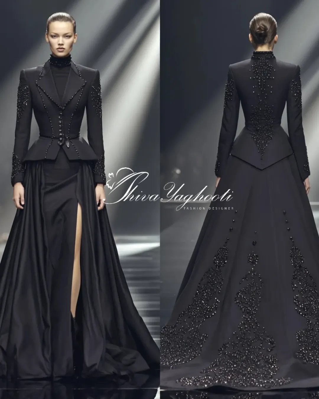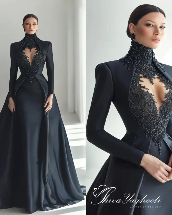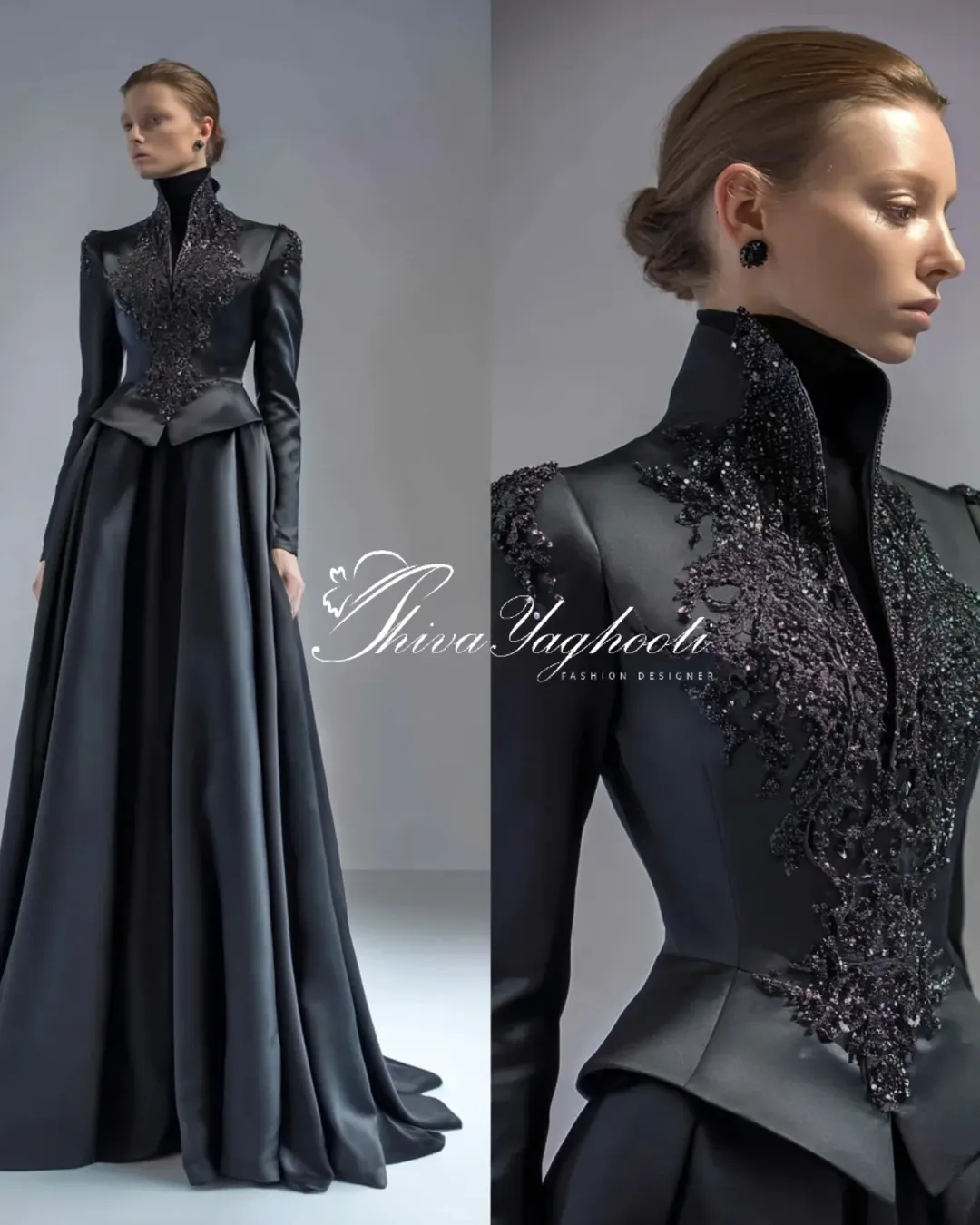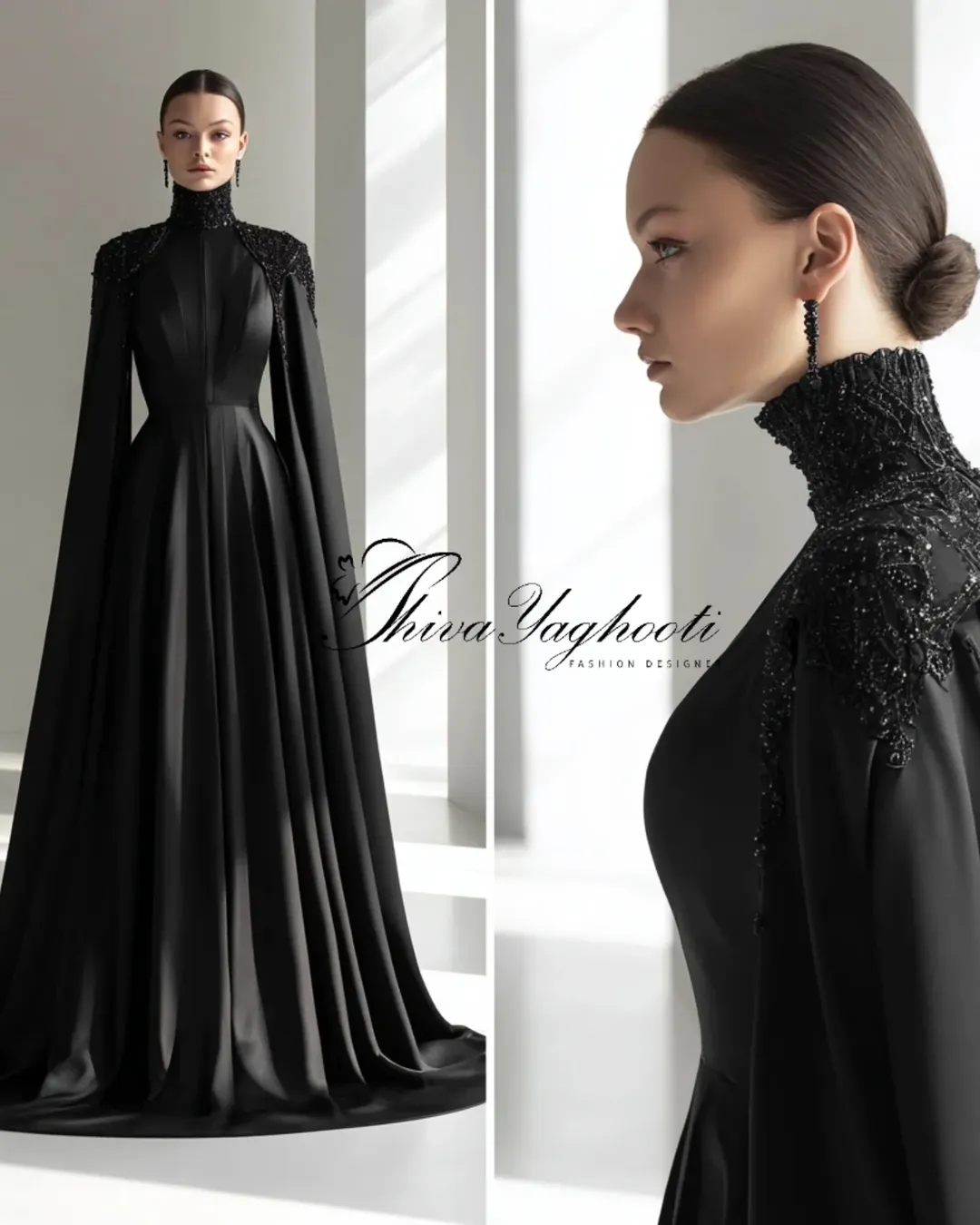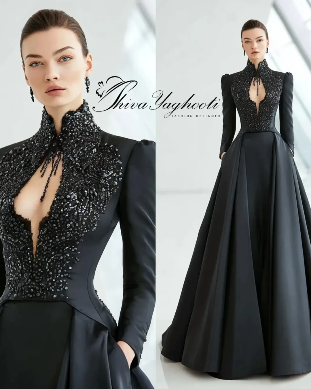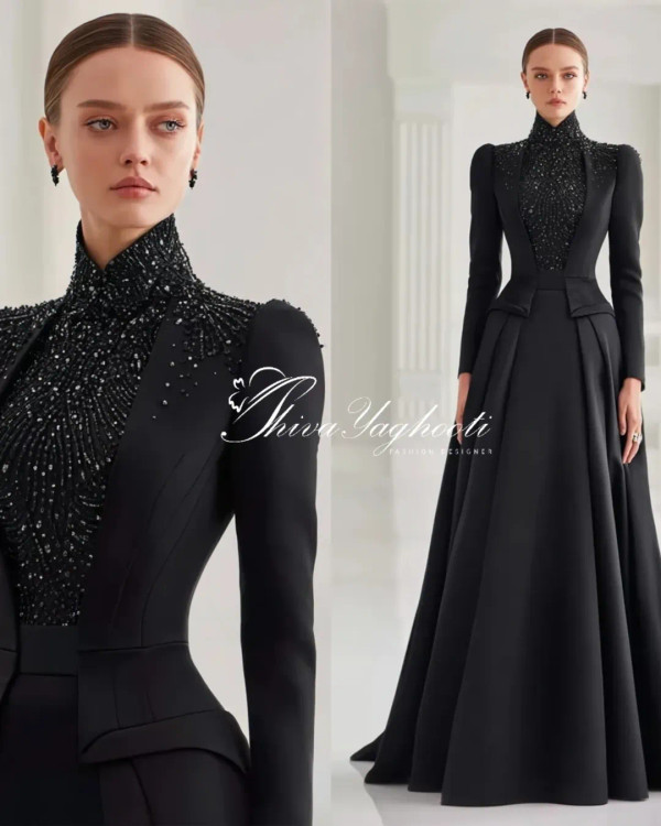 شکوه تاریکی با امضای فاخر این مجموعهی خاص از مزون شیوا یاقوتی، ترکیبی از برشهای سلطنتی، یقههای ایستاده و دامنهای حجیم ساتن است که با سنگدوزیهای ظریف و هنر گلدوزی دستساز تزئین شدهاند. مناسب برای مراسم های مختلط، عقد، عروسی، و رویدادهای لاکچری.