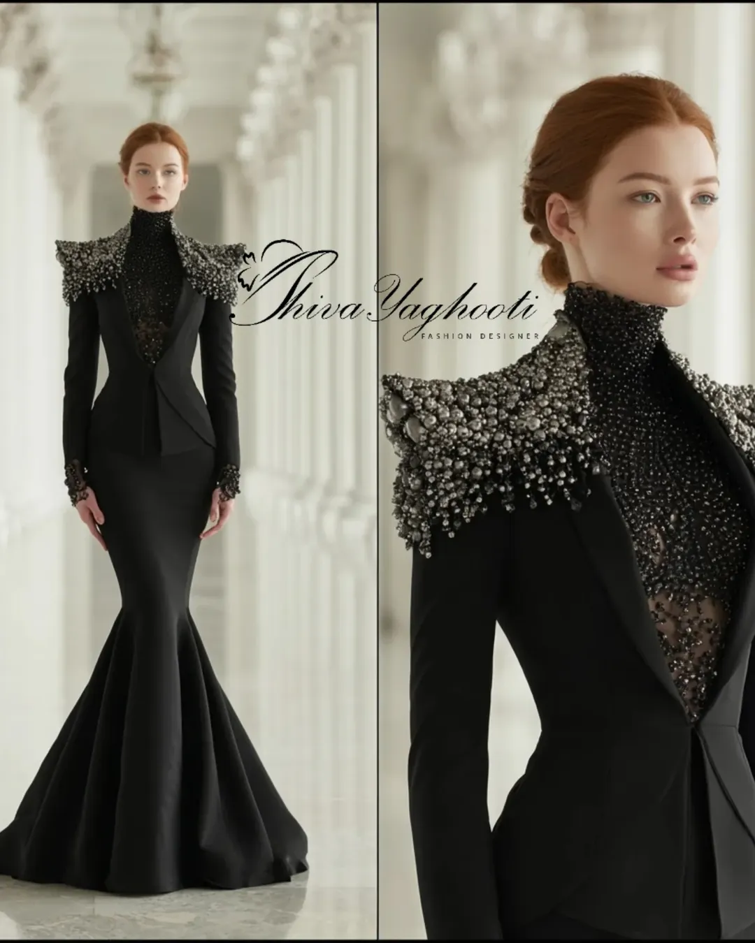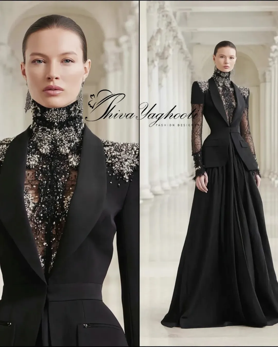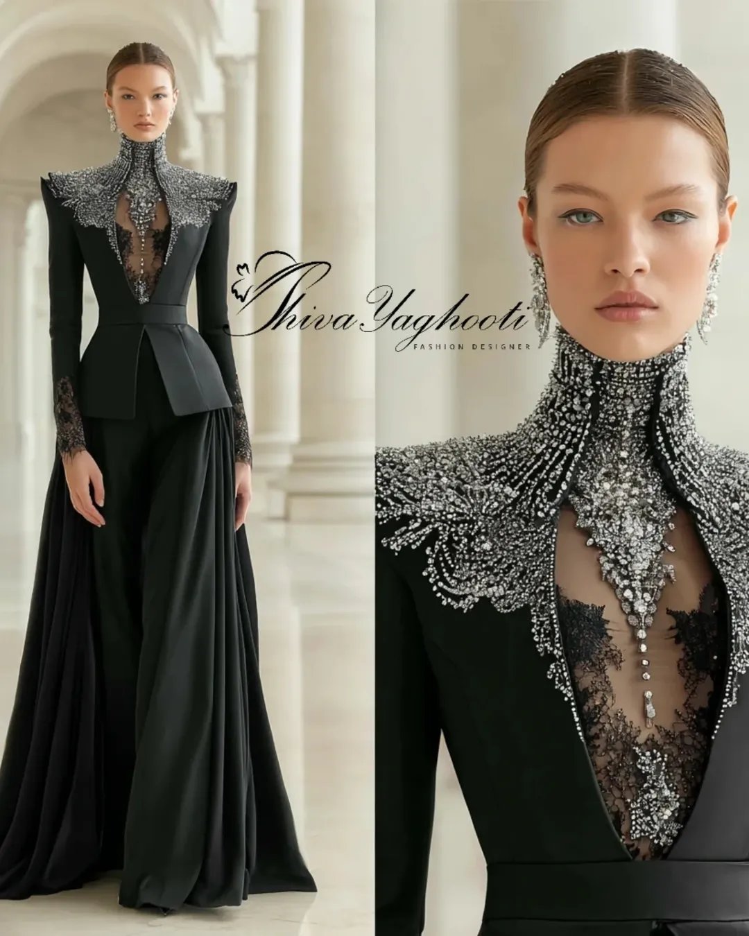 کت شلوار و کت دامن خاص ترکیبی از لِیس دستدوز سهبعدی، یقه بلند کوتور، برشهای معماریشده و سیلوئت قدرتمند و کشیده طراحی شده برای بانوانی که استایل جسور، فاخر و متمایز را انتخاب میکنند. این مدلها نمونه آماده ندارند و فقط بهصورت سفارشی، دقیقاً مطابق سایز شما دوخته میشوند.