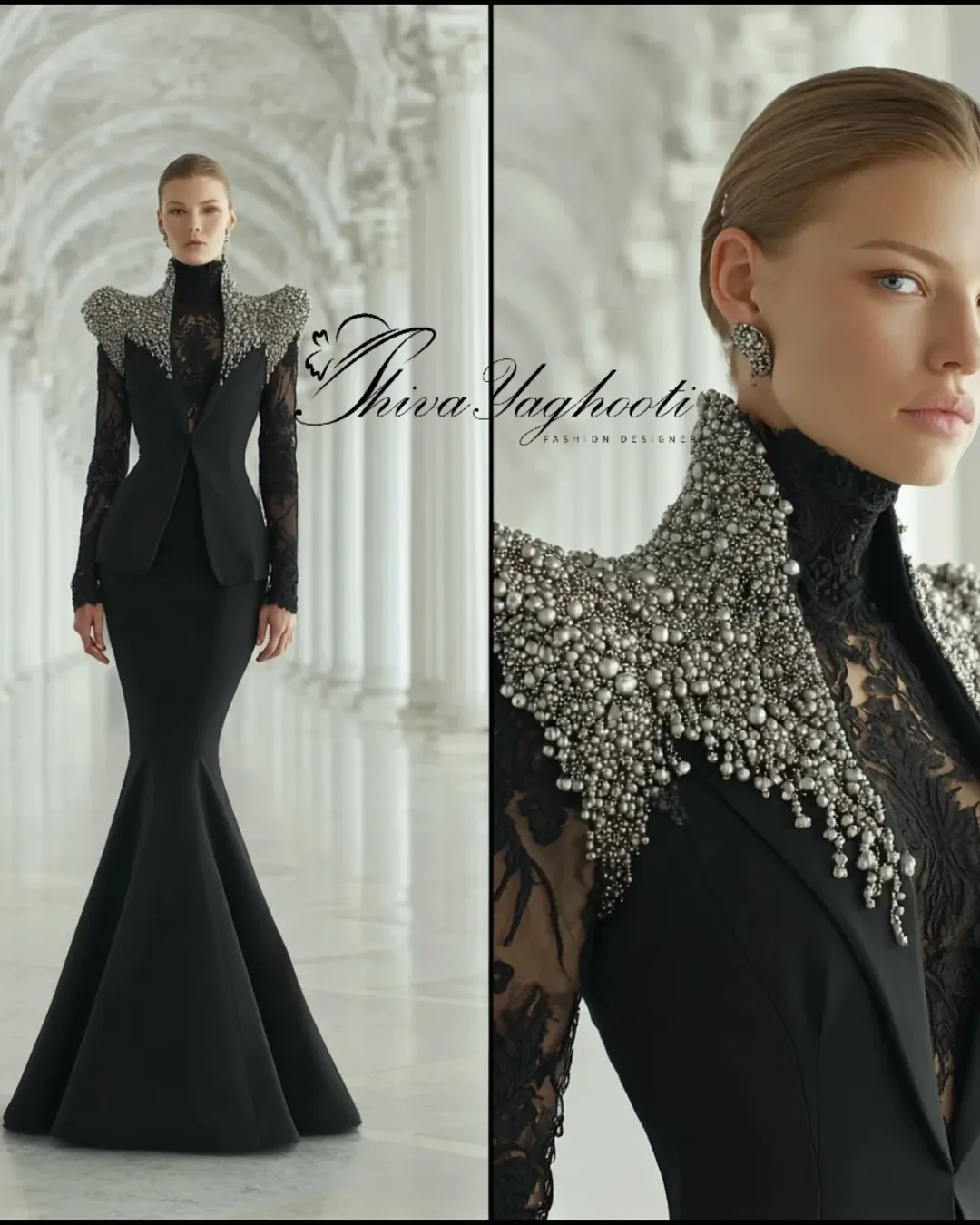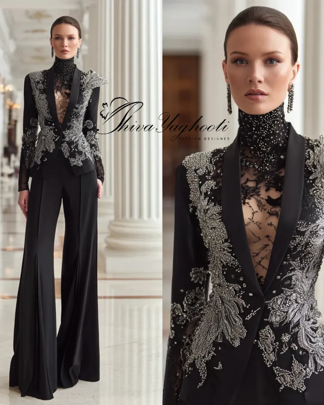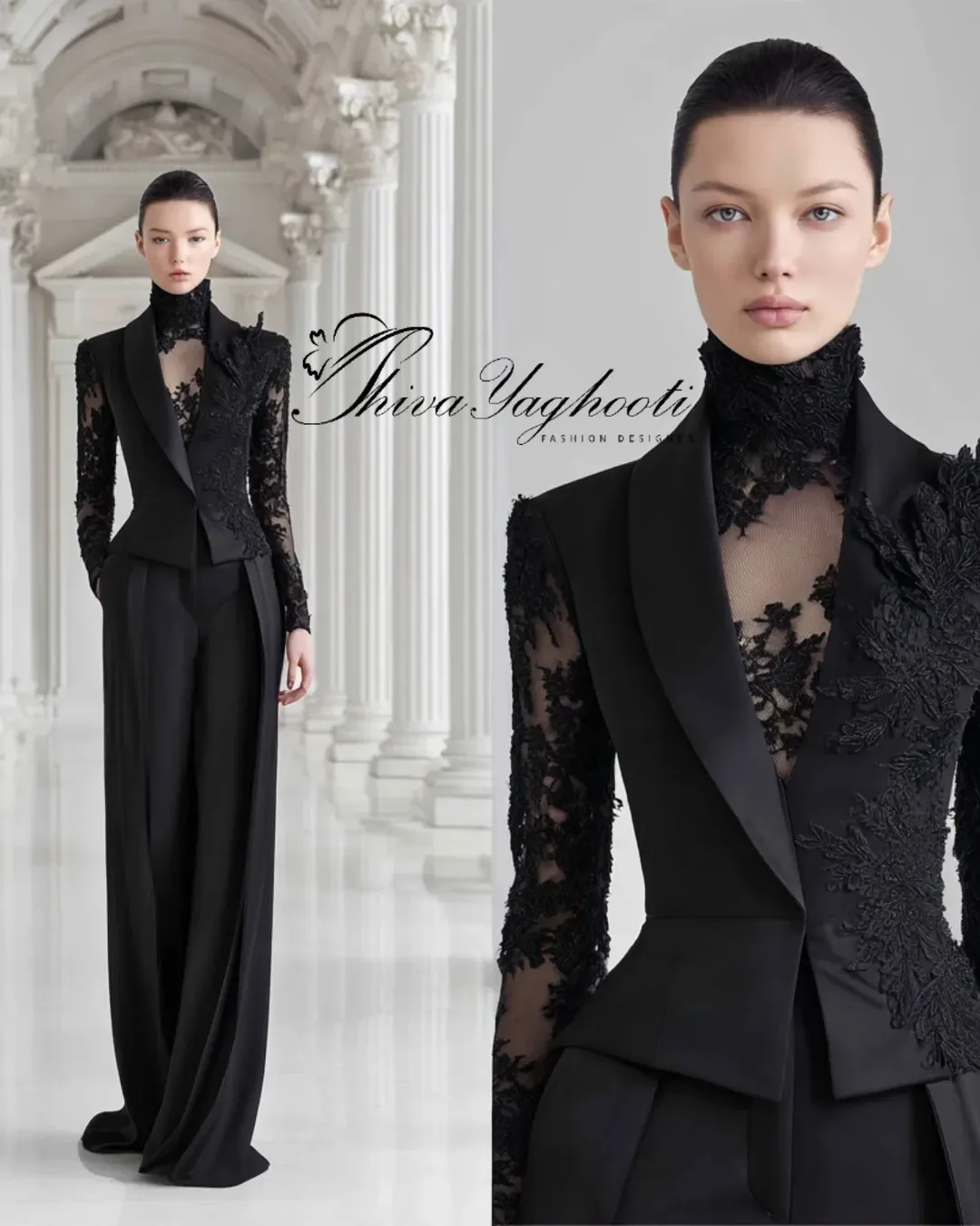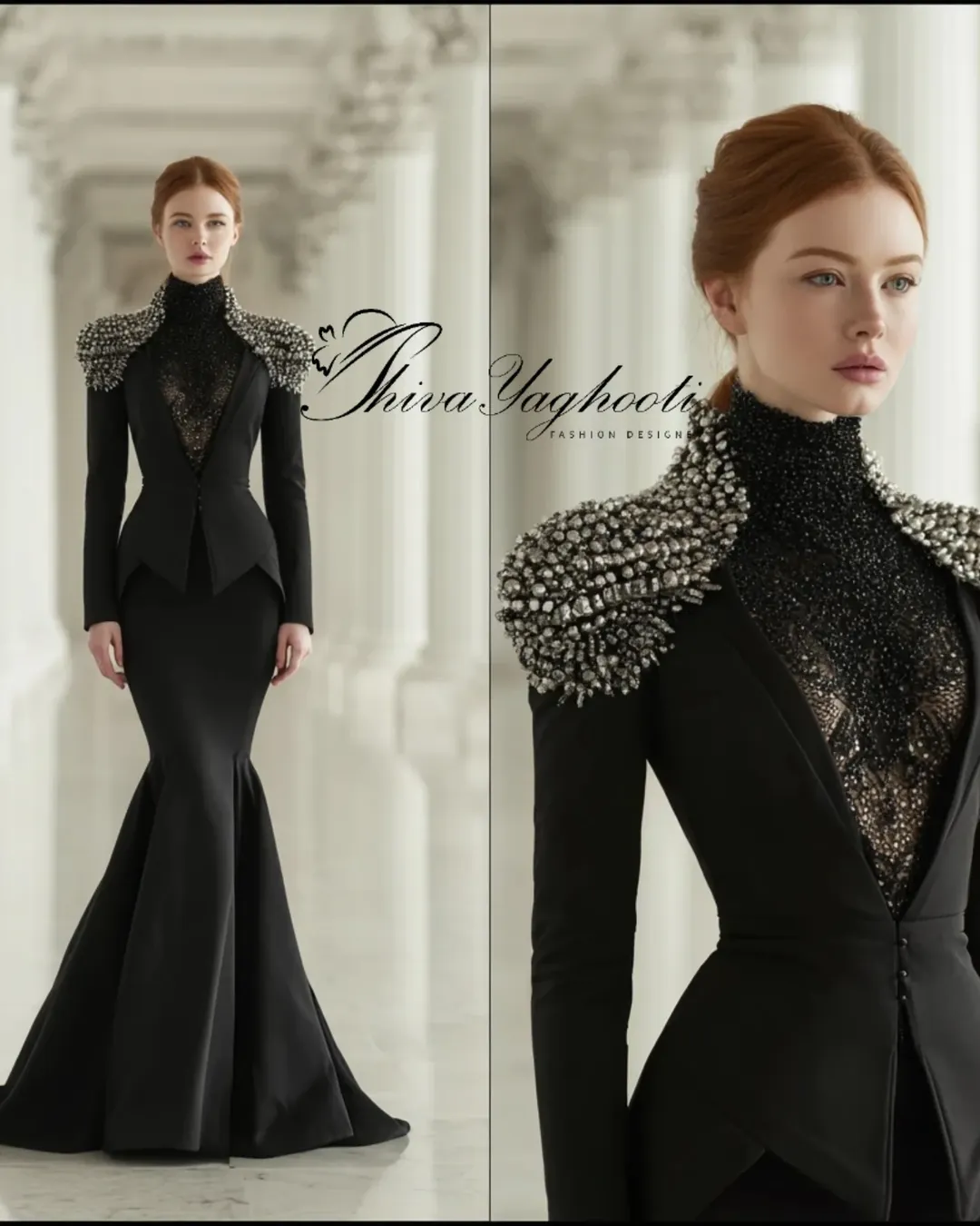 کت شلوار و کت دامن خاص ترکیبی از لِیس دستدوز سهبعدی، یقه بلند کوتور، برشهای معماریشده و سیلوئت قدرتمند و کشیده طراحی شده برای بانوانی که استایل جسور، فاخر و متمایز را انتخاب میکنند. این مدلها نمونه آماده ندارند و فقط بهصورت سفارشی، دقیقاً مطابق سایز شما دوخته میشوند.